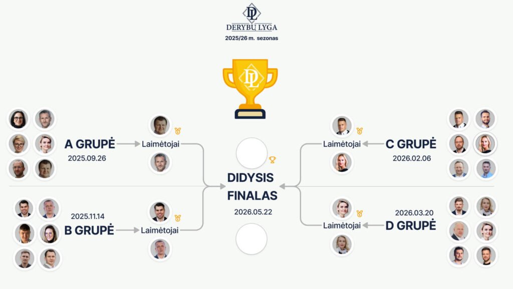 „Derybų Lyga“ 2025/26 m. sezoną vainikuos finalinis renginys, kuriame susitiks stipriausi sezono derybininkai – po du geriausius iš kiekvienos grupės (A, B, C ir D).